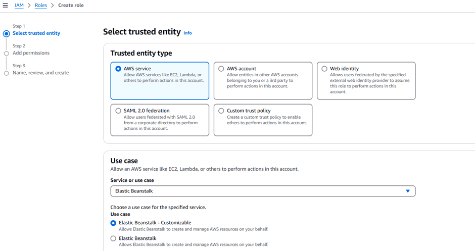 - Under Use cases, search for Elastic Beanstalk and select “Elastic Beanstalk – Customizable”.