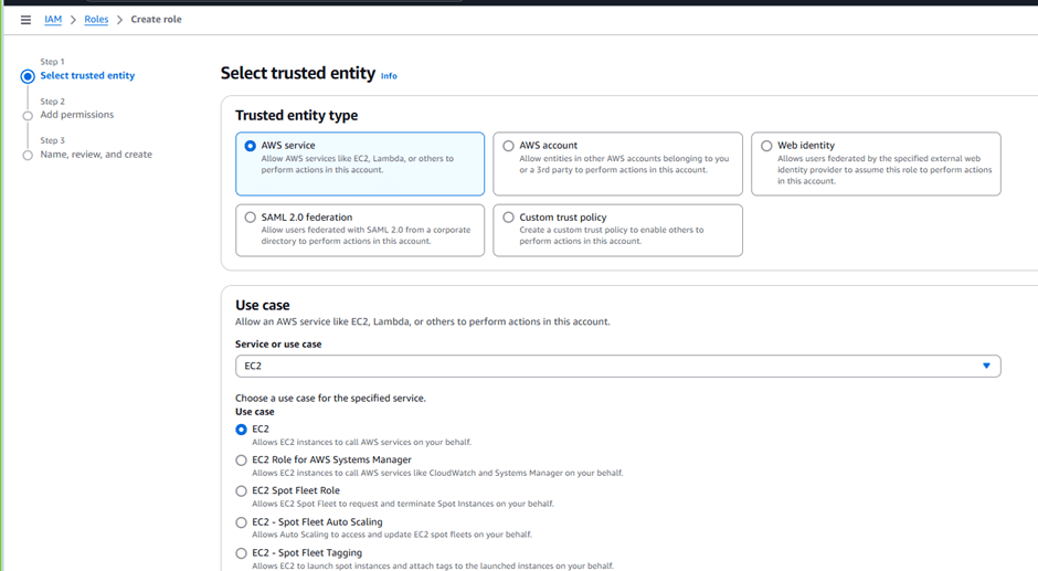 - Select “Create role” again in IAM.