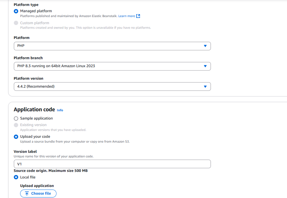 - Under Application code, upload your code. Set the version label to