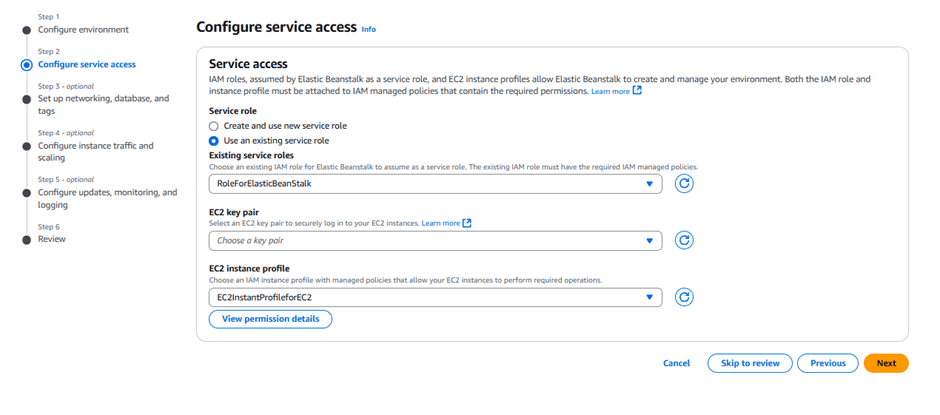 EC2InstanceProfileForElasticBeanstalk. - Click “Next” through the optional configuration pages.