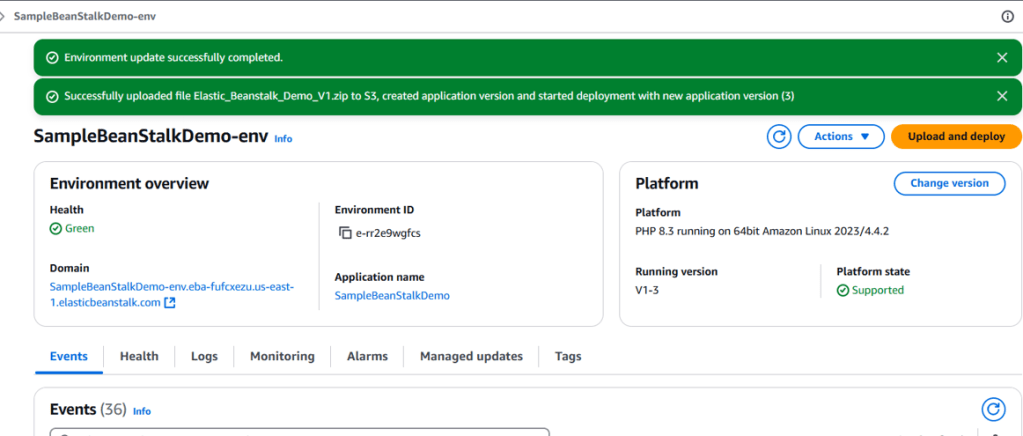 After a few minutes, your Elastic Beanstalk environment will be ready. You’ll see a confirmation message, and you can click the domain URL under the Environment overview to access your application.