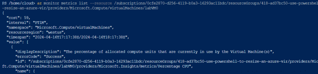 az monitor metrics list –resource /subscriptions/<ID>/resourceGroups/<ResourceGroupName>/providers/Microsoft.Compute/virtualMachines/labVM0