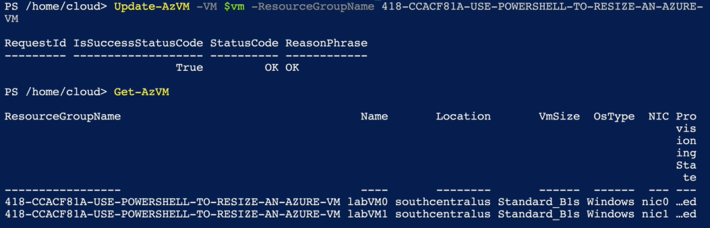 Once we execute this command it will re-size the VM and we can see the output under below screenshot we can see now the VM has been re-sized to B1s from B2s